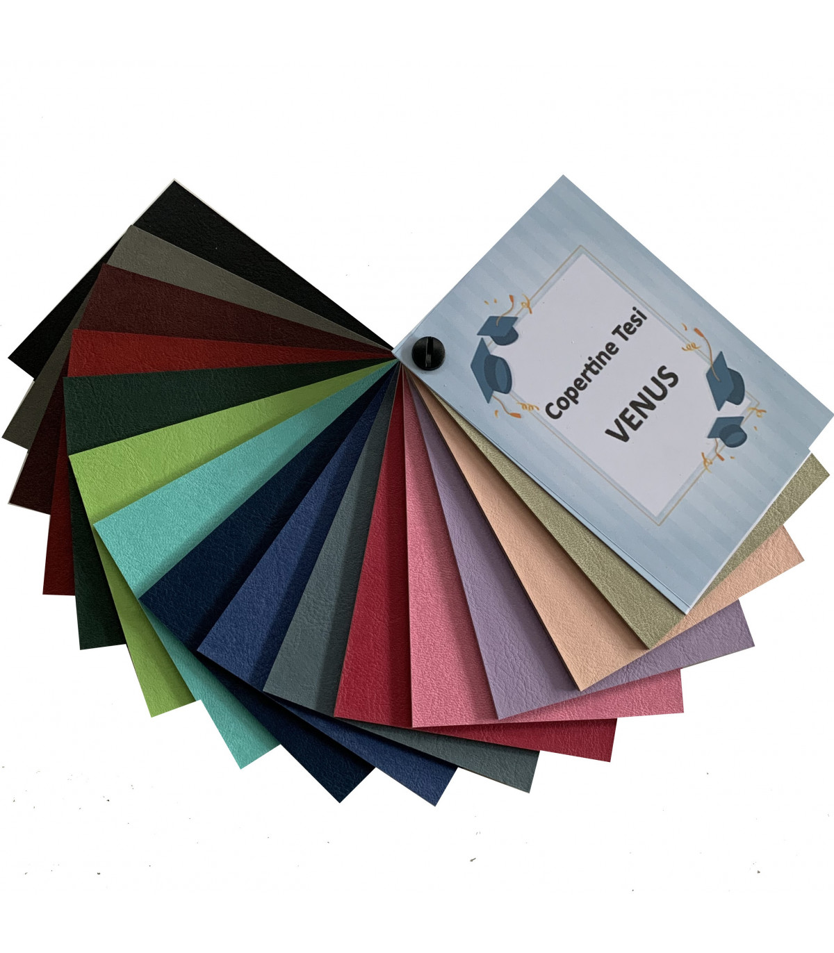 Campionario ufficiale della similpelle Venus, utilizzata per la produzione delle copertine per tesi rigide e morbide della gamma.