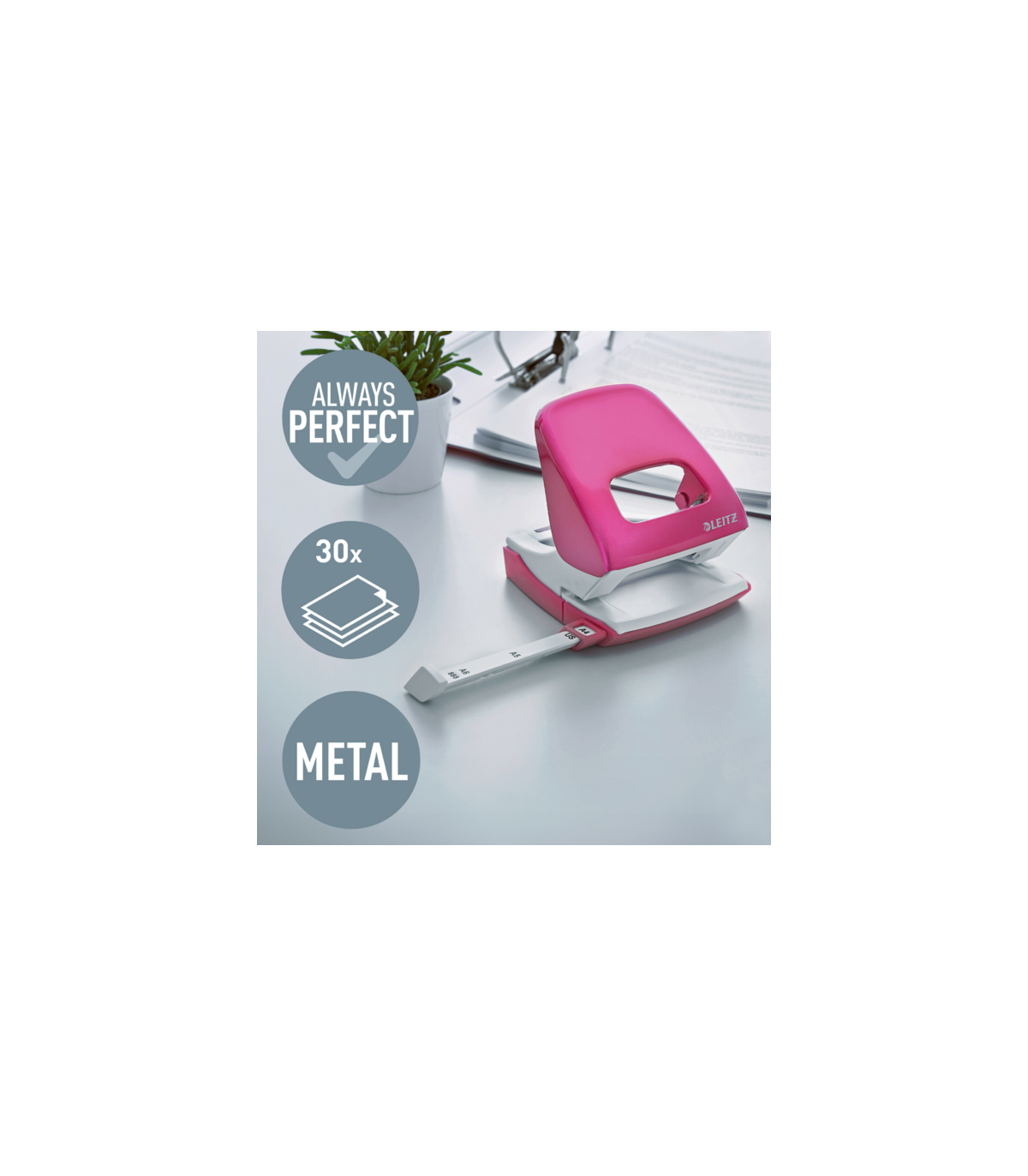 Perforatore in metallo nei colori WOW che riflettono alla perfezione la tua personalità. Per uso quotidiano. Robusto e affidabile. La facile impugnatura e i punzoni ultra appuntiti riducono al minimo lo sforzo di perforazione.